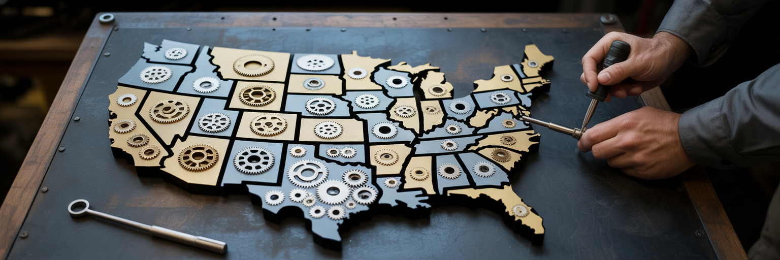 Map of USA made of interlocking gears representing compliance.